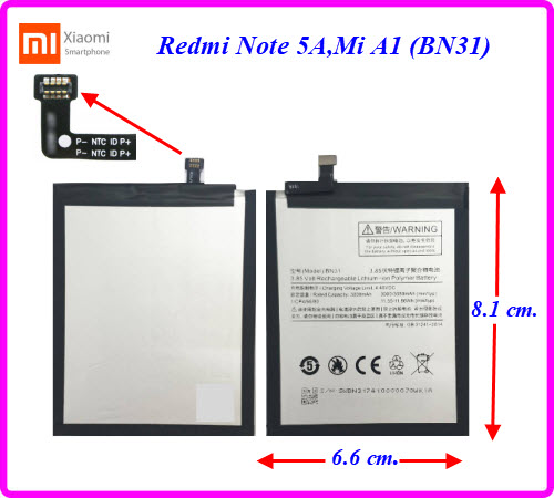 | แบตเตอรี่ Xiaomi Redmi Note 5A,Mi A1 (BN31) 6.6x8.1 cm. 3000 mAh. |