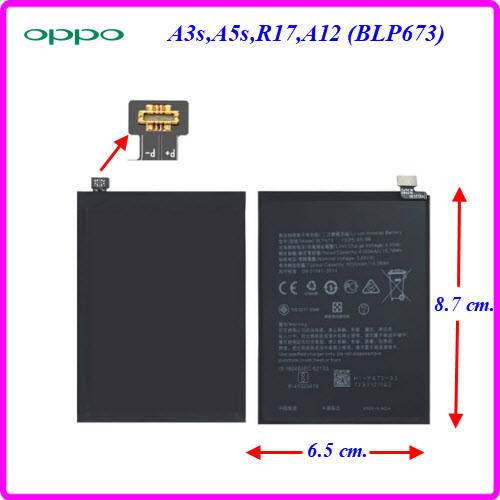 - แบตเตอรี่ Oppo A3s,A5s,R17,A12 (BLP673) 6.5x8.7 cm. 4230 mAh.