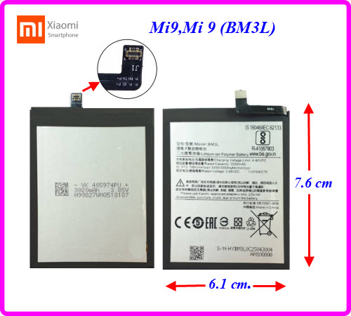 แบตเตอรี่ Xiaomi Mi9,Mi 9 (BM3L) 6.1x7.6 cm. 3300 mAh.